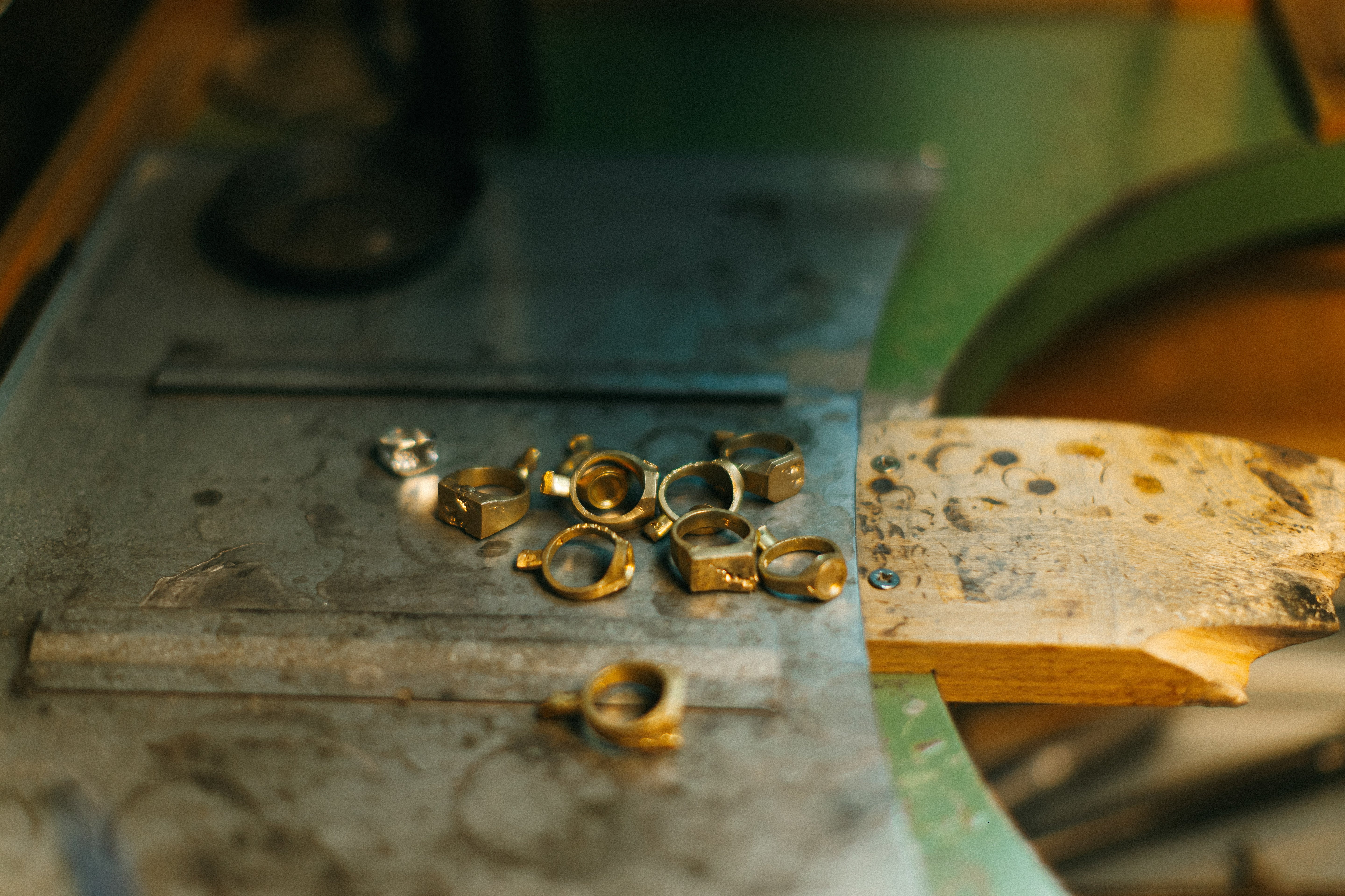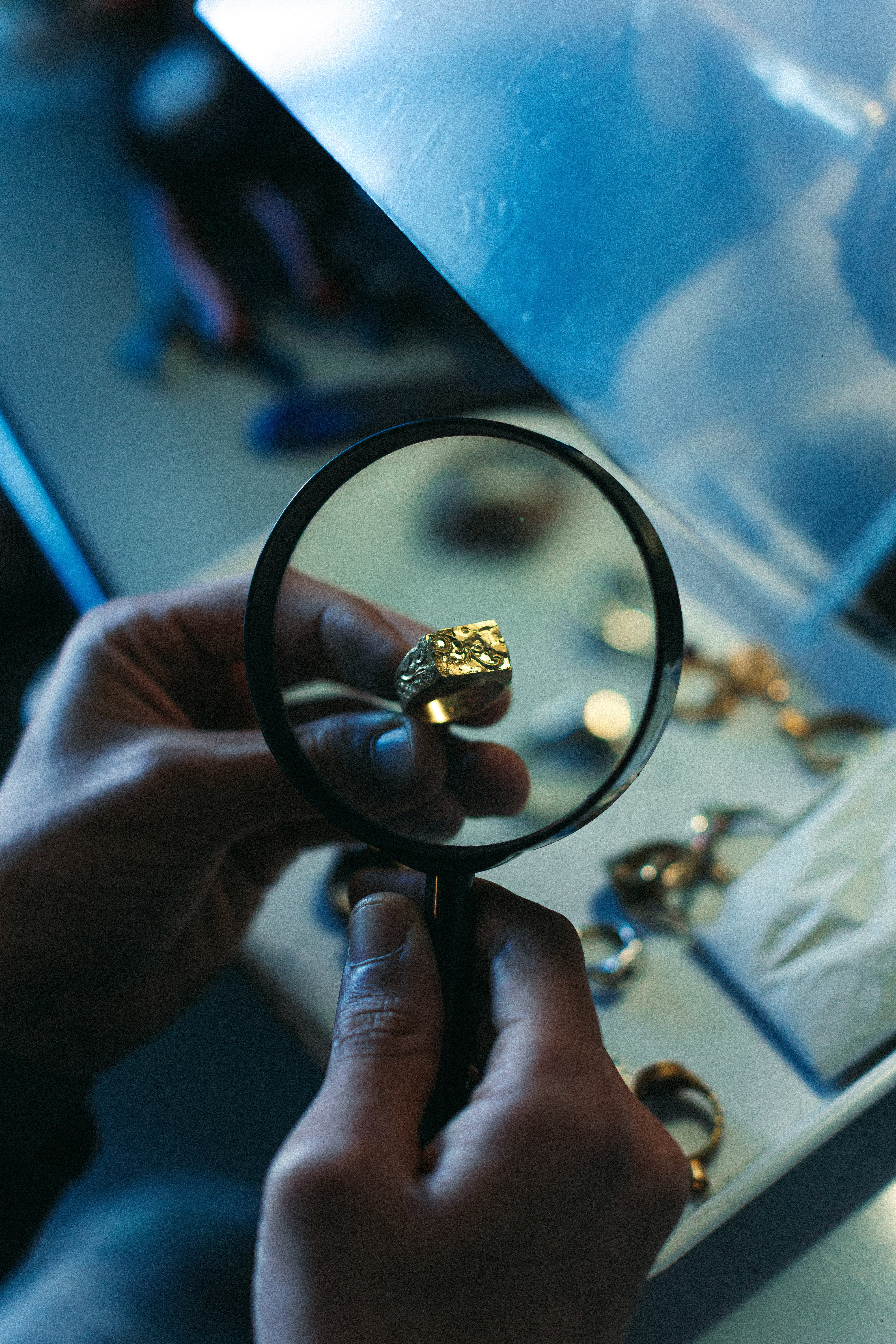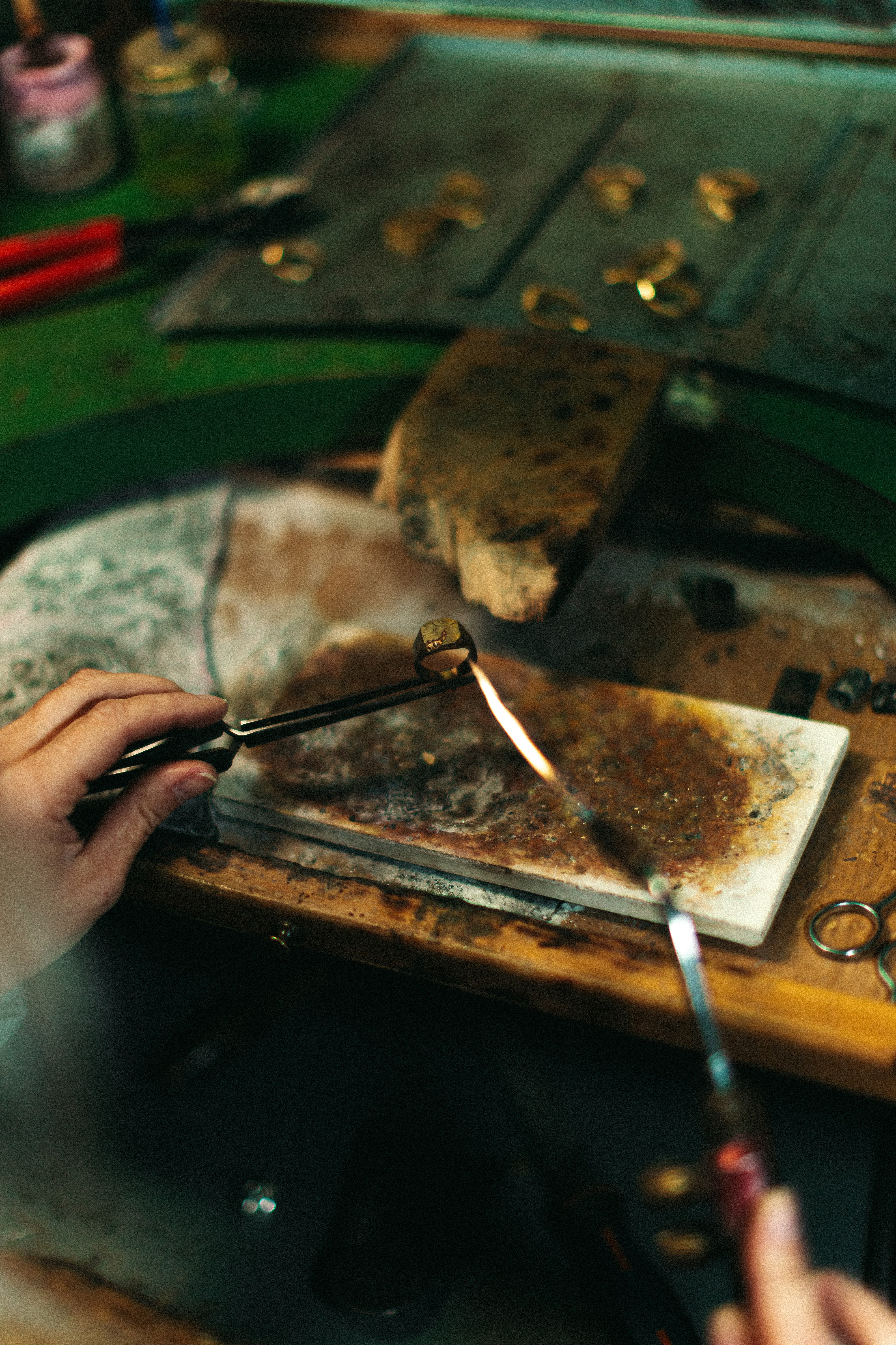 Ogni anello, ogni catena, ogni superficie porta il segno delle mani umane. Metalli preziosi forgiati in laboratori orafi italiani — non assemblati, non prodotti in serie. Forgiati.